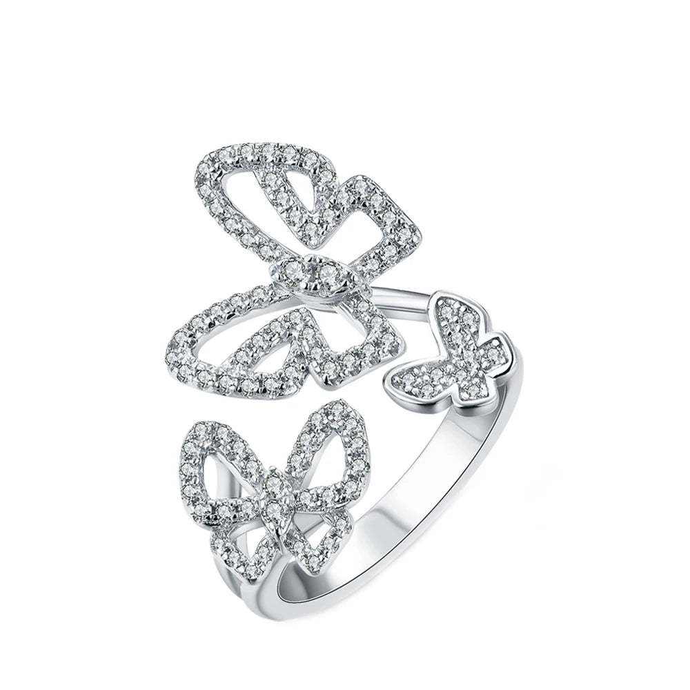 Dieser Ring zeigt drei zarte Schmetterlingssilhouetten, die mit funkelnden Moissanite-Steinen verziert sind und das Licht aus jedem Winkel einfangen. Die Verarbeitung in Sterlingsilber verleiht dem Schmuckstück einen lang anhaltenden Glanz, während die sorgfältige Fassung jeden einzelnen Stein auf traditionelle Weise fixiert;